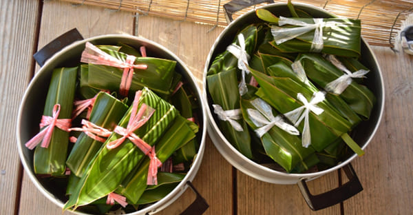 ムーチー(鬼餅)では、もち粉で作ったタネをサンニン(月桃)や桑の葉に包んで蒸す「ムーチー(鬼餅)」をいただいて家族の健康祈願をします。