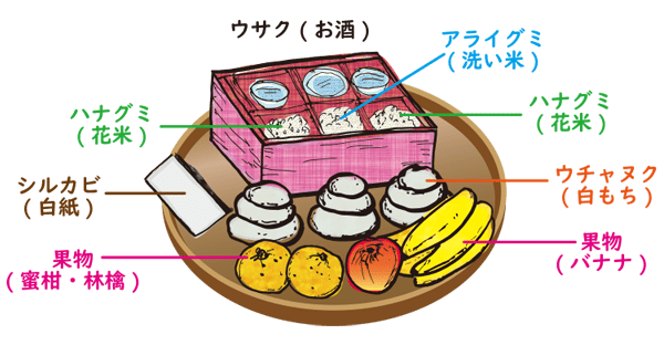 ハナグミ(花米)・アライグミ(洗い米)・ウサク(お酒)、りんごやみかんなどナイムン(果物)もお供えしてお迎えしました。